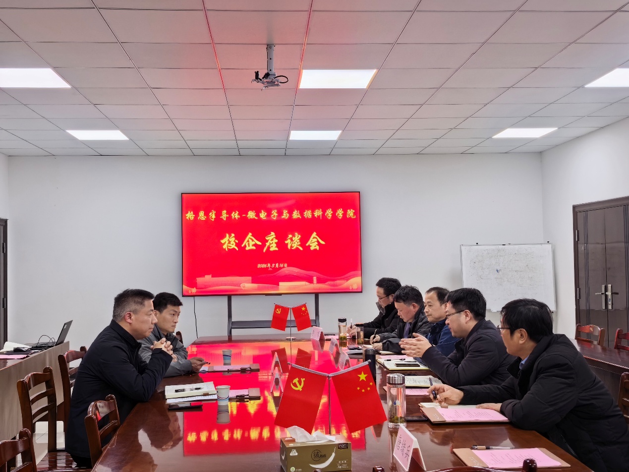 与安徽格恩半导体有限公司在数理楼306会议室举办校企座谈会,学院党政领导、相关系室老师和毕业班辅导员参加座谈。会议由学院副院长李文喜主持。