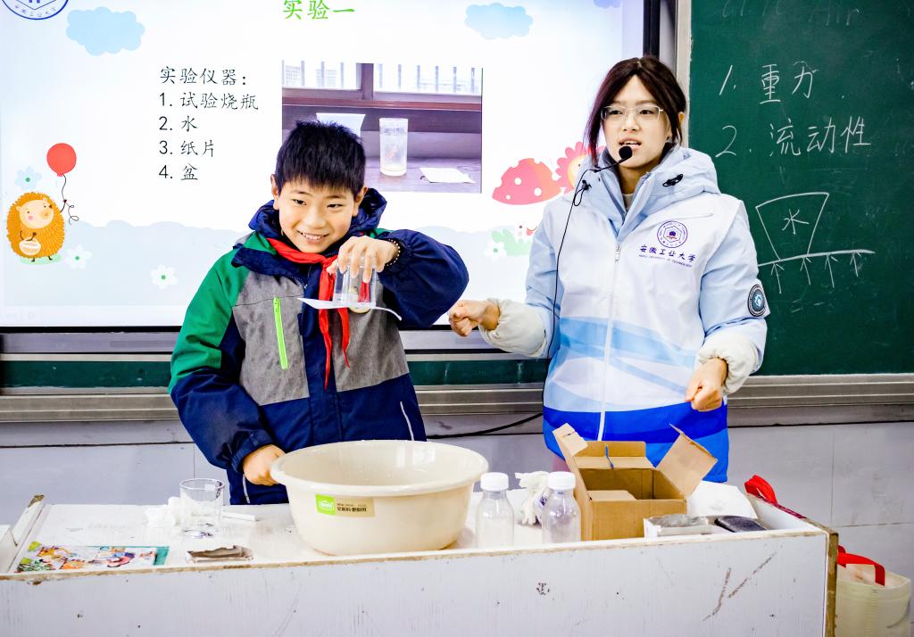 志愿者分两组同步开展教学。围绕 “神奇的大气压” 主题,志愿者结合生活实例引出科学问题,通过动画演示与动手实验相结合的方式,将抽象的科学原理转化为直观可感的教学内容,帮助学生轻松理解大气压的奥秘;在“会跳舞的豆子”主题课堂,志愿者引导学生通过实验观察豆子在不同液体中的运动状态,深入浅出地阐释了浮力与气体之间的关联知识。